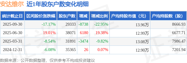 从股价来看,2025年6月30日至2025年9月30日,安达维尔区间跌幅为17.17%,在此期间股东户数减少8738.0户,减幅为22.95%。