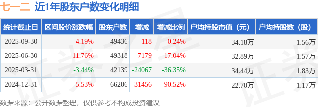 从股价来看,2025年6月30日至2025年9月30日,七一二区间涨幅为4.19%,在此期间股东户数增加118.0户,增幅为0.24%。