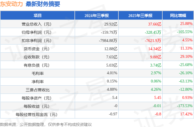 据证券之星公开数据整理,近期东安动力(600178)发布2025年三季报。截至本报告期末,公司营业总收入37.66亿元,同比上升25.88%,归母净利润-328.45万元,同比下降105.55%。按单季度数据看,第三季度营业总收入12.87亿元,同比上升26.18%,第三季度归母净利润-720.57万元,同比下降238.79%。本报告期东安动力公司应收账款体量较大,当期应收账款占最新年报归母净利润比达17229%。