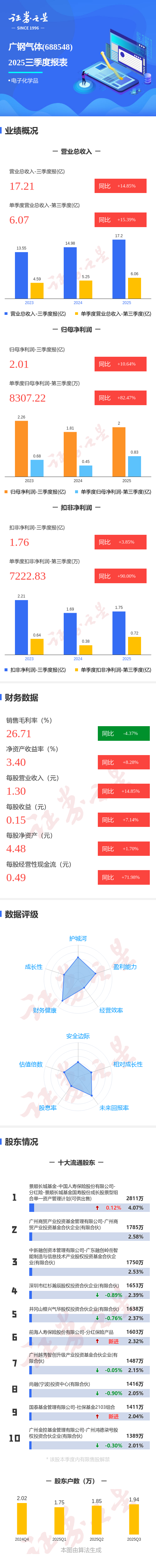 证券之星消息,广钢气体2025年三季报显示,前三季度公司主营收入17.21亿元,同比上升14.85%;归母净利润2.01亿元,同比上升10.64%;扣非净利润1.76亿元,同比上升3.86%;其中2025年第三季度,公司单季度主营收入6.07亿元,同比上升15.4%;单季度归母净利润8307.22万元,同比上升82.47%;单季度扣非净利润7222.83万元,同比上升90.01%;负债率33.28%,投资收益410.44万元,财务费用1440.92万元,毛利率26.71%。