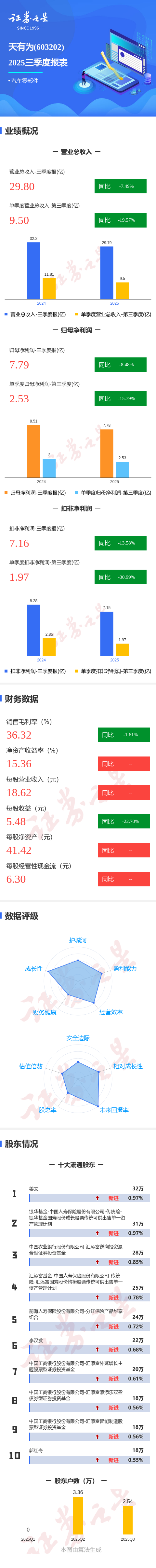 证券之星消息,天有为2025年三季报显示,前三季度公司主营收入29.8亿元,同比下降7.49%;归母净利润7.79亿元,同比下降8.49%;扣非净利润7.16亿元,同比下降13.59%;其中2025年第三季度,公司单季度主营收入9.5亿元,同比下降19.58%;单季度归母净利润2.53亿元,同比下降15.79%;单季度扣非净利润1.97亿元,同比下降30.99%;负债率27.58%,投资收益-271.66万元,财务费用-2738.24万元,毛利率36.32%。