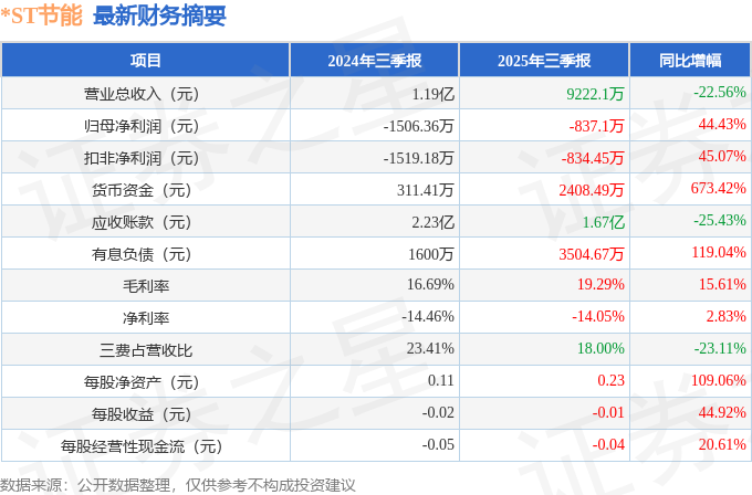 据证券之星公开数据整理,近期*ST节能(000820)发布2025年三季报。截至本报告期末,公司营业总收入9222.1万元,同比下降22.56%,归母净利润-837.1万元,同比上升44.43%。按单季度数据看,第三季度营业总收入7489.99万元,同比上升40.03%,第三季度归母净利润-123.6万元,同比上升67.12%。本报告期*ST节能公司应收账款体量较大,当期应收账款占最新年报营业总收入比达135.02%。