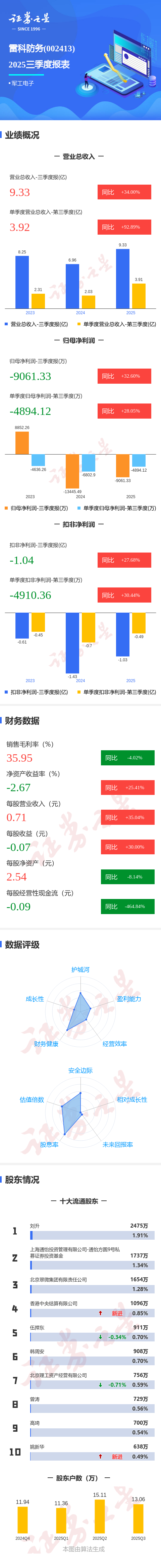 证券之星消息,雷科防务2025年三季报显示,前三季度公司主营收入9.33亿元,同比上升34.0%;归母净利润-9061.33万元,同比上升32.61%;扣非净利润-1.04亿元,同比上升27.68%;其中2025年第三季度,公司单季度主营收入3.92亿元,同比上升92.9%;单季度归母净利润-4894.12万元,同比上升28.06%;单季度扣非净利润-4910.36万元,同比上升30.44%;负债率33.37%,投资收益-561.14万元,财务费用499.1万元,毛利率35.95%。