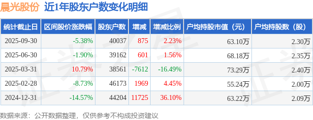 从股价来看,2025年6月30日至2025年9月30日,晨光股份区间跌幅为5.38%,在此期间股东户数增加875.0户,增幅为2.23%。