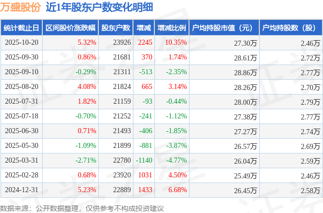 从股价来看,2025年9月30日至2025年10月20日,万盛股份区间涨幅为5.32%,在此期间股东户数增加2245.0户,增幅为10.35%。