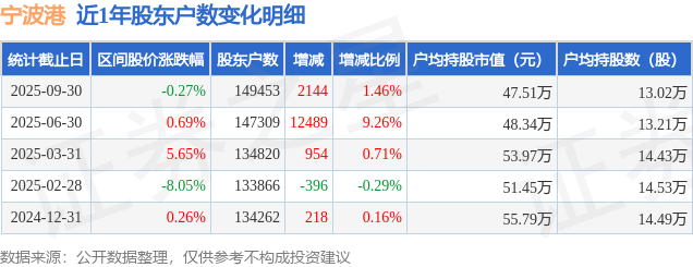从股价来看,2025年6月30日至2025年9月30日,宁波港区间跌幅为0.27%,在此期间股东户数增加2144.0户,增幅为1.46%。