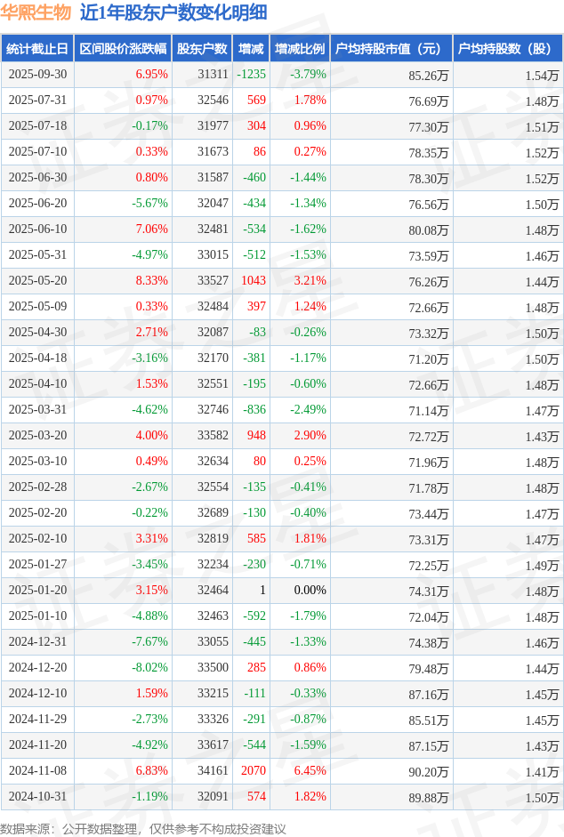 从股价来看,2025年7月31日至2025年9月30日,华熙生物区间涨幅为6.95%,在此期间股东户数减少1235.0户,减幅为3.79%。