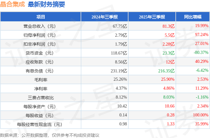 据证券之星公开数据整理,近期晶合集成(688249)发布2025年三季报。截至本报告期末,公司营业总收入81.3亿元,同比上升19.99%,归母净利润5.5亿元,同比上升97.24%。按单季度数据看,第三季度营业总收入29.31亿元,同比上升23.3%,第三季度归母净利润2.18亿元,同比上升137.18%。本报告期晶合集成应收账款上升,应收账款同比增幅达40.29%。