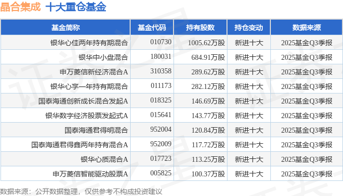 持有晶合集成最多的基金为银华心佳两年持有期混合,目前规模为67.16亿元,最新净值0.982(10月30日),较上一交易日下跌0.14%,近一年上涨53.46%。该基金现任基金经理为李晓星 张腾 杜宇。