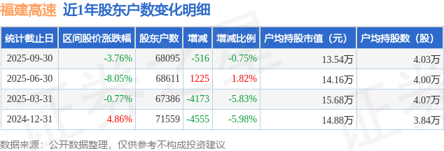 从股价来看,2025年6月30日至2025年9月30日,福建高速区间跌幅为3.76%,在此期间股东户数减少516.0户,减幅为0.75%。