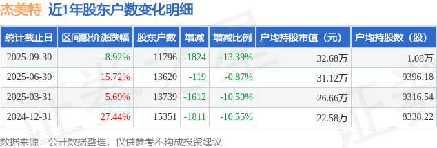 从股价来看,2025年6月30日至2025年9月30日,杰美特区间跌幅为8.92%,在此期间股东户数减少1824.0户,减幅为13.39%。