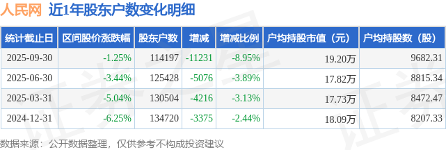 从股价来看,2025年6月30日至2025年9月30日,人民网区间跌幅为1.25%,在此期间股东户数减少1.12万户,减幅为8.95%。