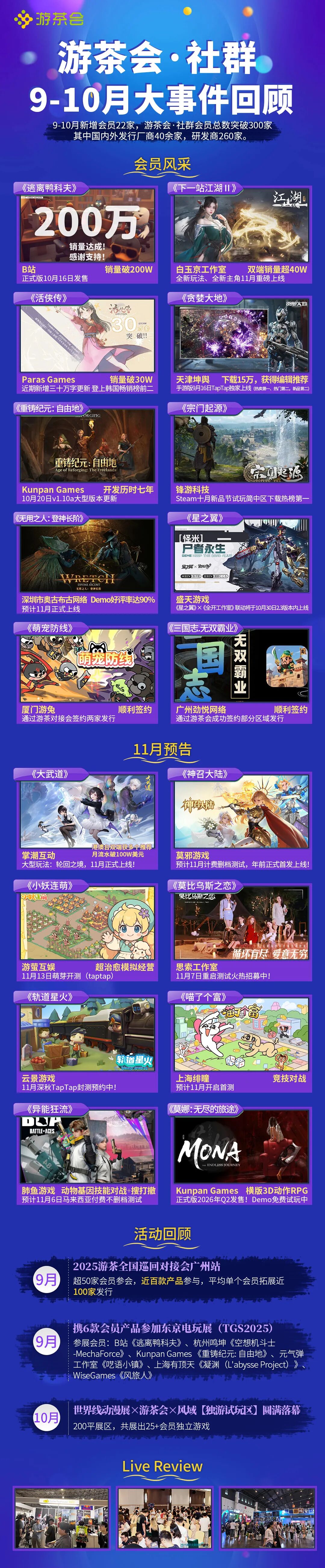 让我们共同见证游茶会·社群会员的精彩成果,过去两个月,多家会员迎来游戏发售、开测、重大更新等关键节点,更有两家会员成功签约发行!在此,恭贺以下会员团队。