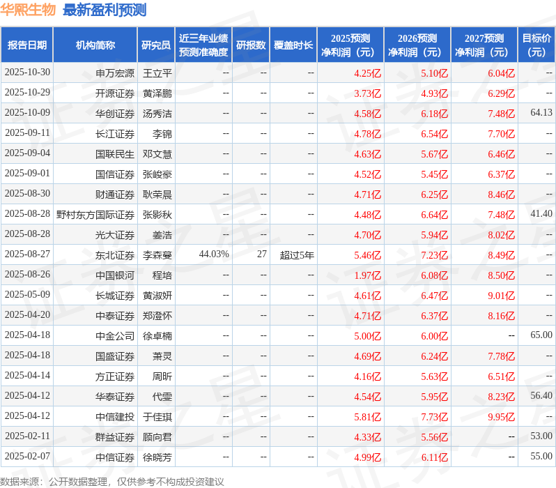最新盈利预测明细如下: