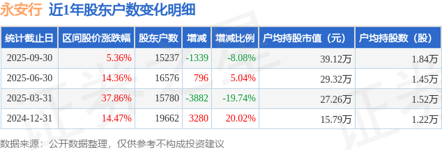 从股价来看,2025年6月30日至2025年9月30日,永安行区间涨幅为5.36%,在此期间股东户数减少1339.0户,减幅为8.08%。
