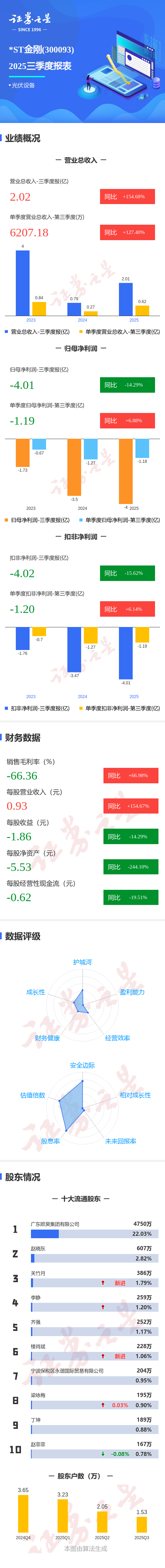 证券之星消息,*ST金刚2025年三季报显示,前三季度公司主营收入2.02亿元,同比上升154.69%;归母净利润-4.01亿元,同比下降14.29%;扣非净利润-4.02亿元,同比下降15.62%;其中2025年第三季度,公司单季度主营收入6207.18万元,同比上升127.41%;单季度归母净利润-1.19亿元,同比上升6.89%;单季度扣非净利润-1.2亿元,同比上升6.15%;负债率141.46%,财务费用1.43亿元,毛利率-66.36%。