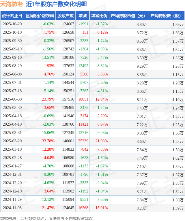 从股价来看,2025年10月10日至2025年10月20日,天海防务区间跌幅为0.63%,在此期间股东户数减少1991.0户,减幅为1.57%。