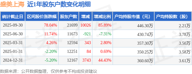从股价来看,2025年6月30日至2025年9月30日,盛美上海区间涨幅为78.04%,在此期间股东户数增加1.0万户,增幅为85.89%。