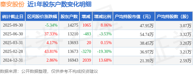 从股价来看,2025年6月30日至2025年9月30日,秦安股份区间跌幅为5.34%,在此期间股东户数增加1065.0户,增幅为8.06%。