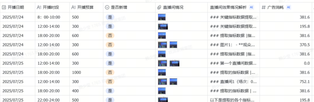 这时候,AI也开始干活了,对截图进行一波解析后,把广告消耗、直播间效果情况都挨个总结好,再自动填到对应的表格里。