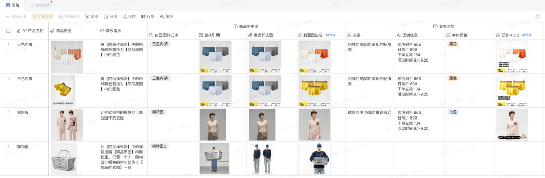 在多维表格里先把基础的商品原图和样式图放上去,再把所有的设计需求都列出来,让AI根据具体需求生成设计图。