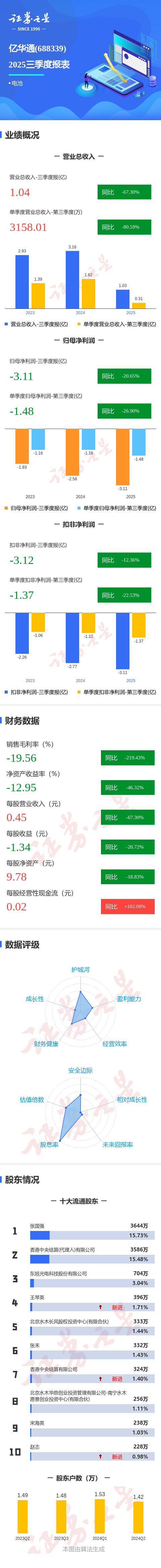 证券之星消息,亿华通2025年三季报显示,前三季度公司主营收入1.04亿元,同比下降67.31%;归母净利润-3.11亿元,同比下降20.66%;扣非净利润-3.12亿元,同比下降12.37%;其中2025年第三季度,公司单季度主营收入3158.01万元,同比下降80.6%;单季度归母净利润-1.48亿元,同比下降26.9%;单季度扣非净利润-1.37亿元,同比下降22.53%;负债率39.22%,投资收益-4795.54万元,财务费用919.78万元,毛利率-19.56%。