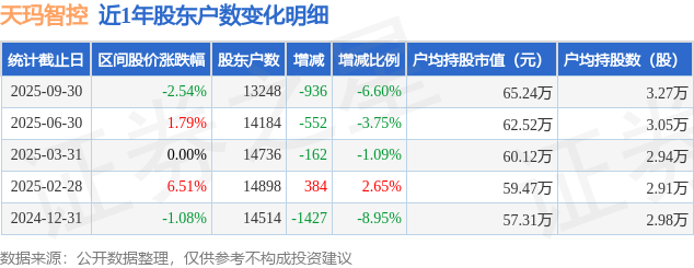 从股价来看,2025年6月30日至2025年9月30日,天玛智控区间跌幅为2.54%,在此期间股东户数减少936.0户,减幅为6.6%。
