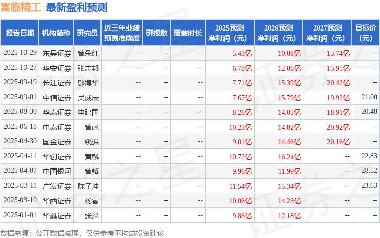 富临精工(300432) 10月28日,公司发布25三季报业绩。1-3Q25年公司收入90.85亿元,同比+54.4%,扣非归母净利润2.61亿元,同比+4.8%。25Q3单季度公司收入32.72亿元,同比+43%,环比+5%,扣非归母净利润1.39亿元,同比+6.7%,环比+265.7%。 经营分析 1、铁锂优势显著,持续放量。公司磷酸铁锂快充产品凭借性能优势,出货量迅速提升;公司持续推进精益化生产及精细化管理,在坚持技术革新与成本节降等多方面进行努力,持续改善磷酸铁锂正极材料业务经营业绩。 2、宁德时代拟对江西升华增资,完成后预计形成控股。公司与宁德时代拟共同对公司子公司江西升华增资扩股,公司拟增资人民币10亿元,认购江西升华新增注册资本人民币8.1亿元,宁德时代拟增资人民币25.6元,认购江西升华新增注册资本人民币20.8亿元。本次交易完成后,宁德时代持有江西升华的股权比例为51%,公司持有江西升华的股权比例为47.4%。 3、公司积极拓宽机器人布局。公司积极拓展并把握智能机器人产业的机遇,将持续通过技术和产品创新与行业头部客户技术创新升级趋势及市场需求紧密结合,拓宽公司机器人电关节模组产业布局,提升技术和产品创新能力,推动公司人形机器人、机器狗等电关节模组的研发和制造水平。 盈利预测、估值与评级 公司高压密产品性能行业领先,锁定大客户持续扩产,看好后续份额提升和盈利上行;汽零业务稳步推进,多项产品细分冠军,业绩稳定放量;机器人领域积极开拓布局。我们预计公司25-27年归母净利润分别为4.5/7.9/12.2亿元(暂不考虑对江西升华的股权变动),维持“买入”评级。 风险提示 磷酸铁锂电池需求不及预期,机器人进展不及预期。