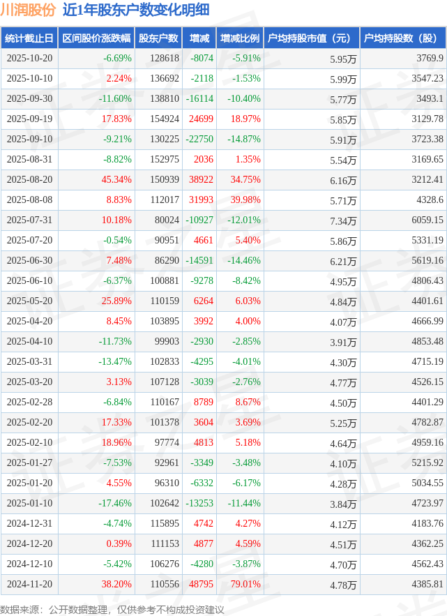 从股价来看,2025年10月10日至2025年10月20日,川润股份区间跌幅为6.69%,在此期间股东户数减少8074.0户,减幅为5.91%。