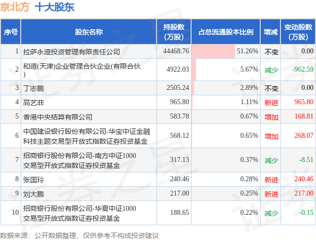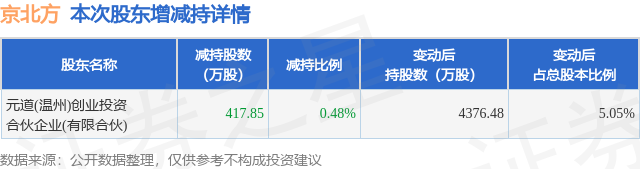 证券之星消息,11月2日京北方发布公告《京北方:关于控股股东、实际控制人之一致行动人股份减持计划期限届满暨实施结果的公告》,其股东元道(温州)创业投资合伙企业(有限合伙)于2025年10月10日至2025年11月2日间合计减持417.85万股,占公司目前总股本的0.4817%,变动期间该股股价下跌1.53%,截止10月31日收盘报21.3元。