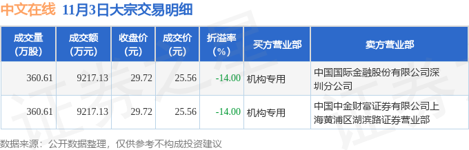 证券之星消息,11月3日中文在线发生大宗交易,交易数据如下: