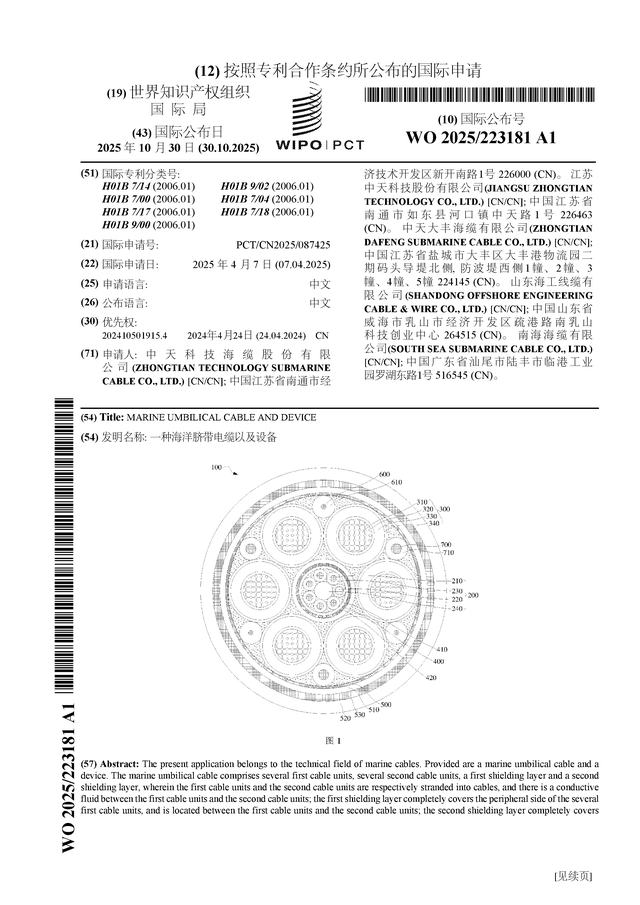 证券之星消息,根据企查查数据显示中天科技(600522)公布了一项国际专利申请,专利名为“一种海洋脐带电缆以及设备”,专利申请号为PCT/CN2025/087425,国际公布日为2025年10月30日。