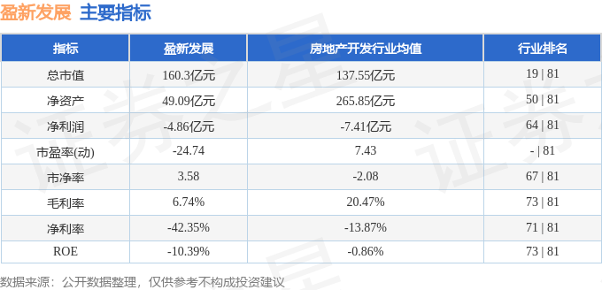 盈新发展主要指标及行业内排名如下: