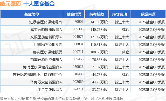 根据2025基金Q3季报公募基金重仓股数据,重仓该股的公募基金共48家,其中持有数量最多的公募基金为汇添富基金的汇添富医药保健混合。汇添富医药保健混合目前规模为24.86亿元,最新净值2.049(10月31日),较上一交易日上涨3.33%,近一年上涨27.58%。该公募基金现任基金经理为郑磊。郑磊在任的基金产品包括:汇添富中盘积极成长混合A,管理时间为2020年3月13日至今,期间收益率为46.42%;汇添富医疗积极成长一年持有混合A,管理时间为2020年8月21日至今,期间收益率为-23.4%;汇添富成长领先混合A,管理时间为2021年12月10日至今,期间收益率为17.0%。