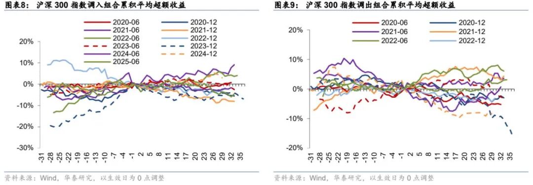 从指数定位来看,有别于上证50指数在市值域上独占鳌头的地位,沪深300指数与下方的中证500指数几乎“接壤”。被调出的沪深300成分股通常位于临界端的股票,在沪深300中权重较小,但有较大概率下移至中证500指数并成为其中的头部成分;因此,调出组可能受到双向的资金冲击,从而造成波动。调入组同样存在类似的影响因素,但由于指数“缓冲”机制的存在,新成分的调入门槛较高,新晋成分股往往具有较强的竞争力,可能因此导致调入组合的确定性更高。