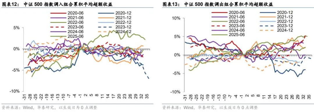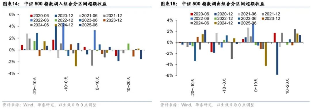 我们基于2020年以来的宽基指数实际调仓情况,分别计算调入和调出组合的日度平均收益率,观察组合平均收益的变化情况;同时,我们减去对应基准指数的收益,以消除Beta的影响,并将生效日作为Day_0进行收益调整。