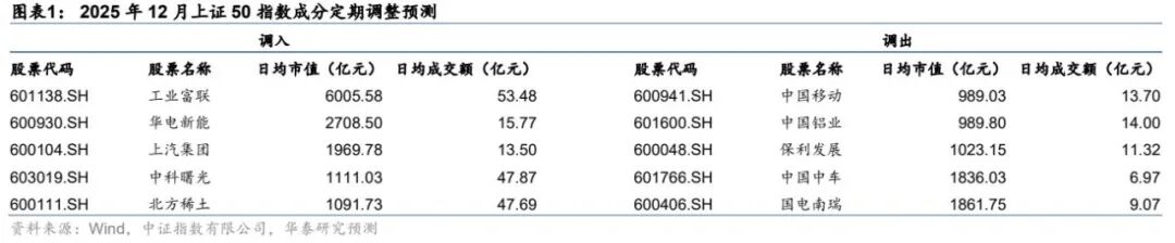 根据中证指数公司的指数编制与调整办法,依据上述调整流程,我们对2025年12月上证50指数的成分股调整做出以下预测,本次预计分别调入与调出5只股票: