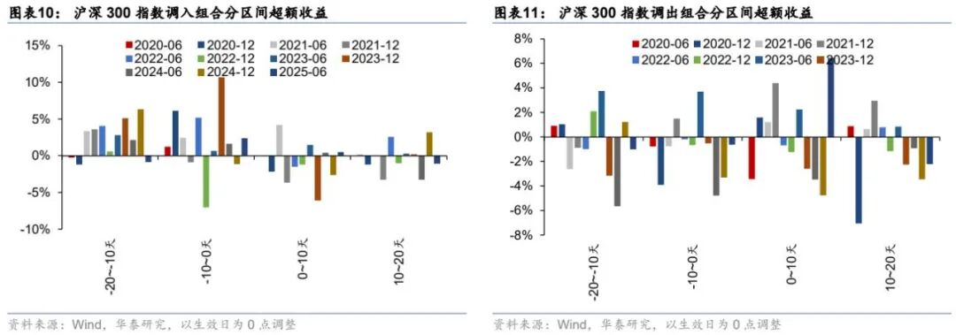 从沪深300指数调整组合的统计结果来看,调入组的确定性相对更高,在-20~-10日区间内有很高的概率呈现正超额收益,在~10-0日内波动出现放大,但正超额的概率仍旧更高;生效日后,沪深300的调入组合整体表现趋于无序,且0~10日间呈现负向的期望超额收益。沪深300的调出组合相对分歧较大,在不同年份之间差异较为明显,其中-10~0日间,调出组合的负超额收益概率较高,但幅度较为有限。