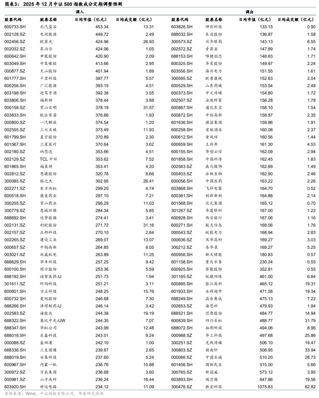 根据中证指数公司的指数编制与调整办法,依据上述调整流程,我们对2025年12月中证500指数的成分股调整做出以下预测,本次预计分别调入与调出50只股票: