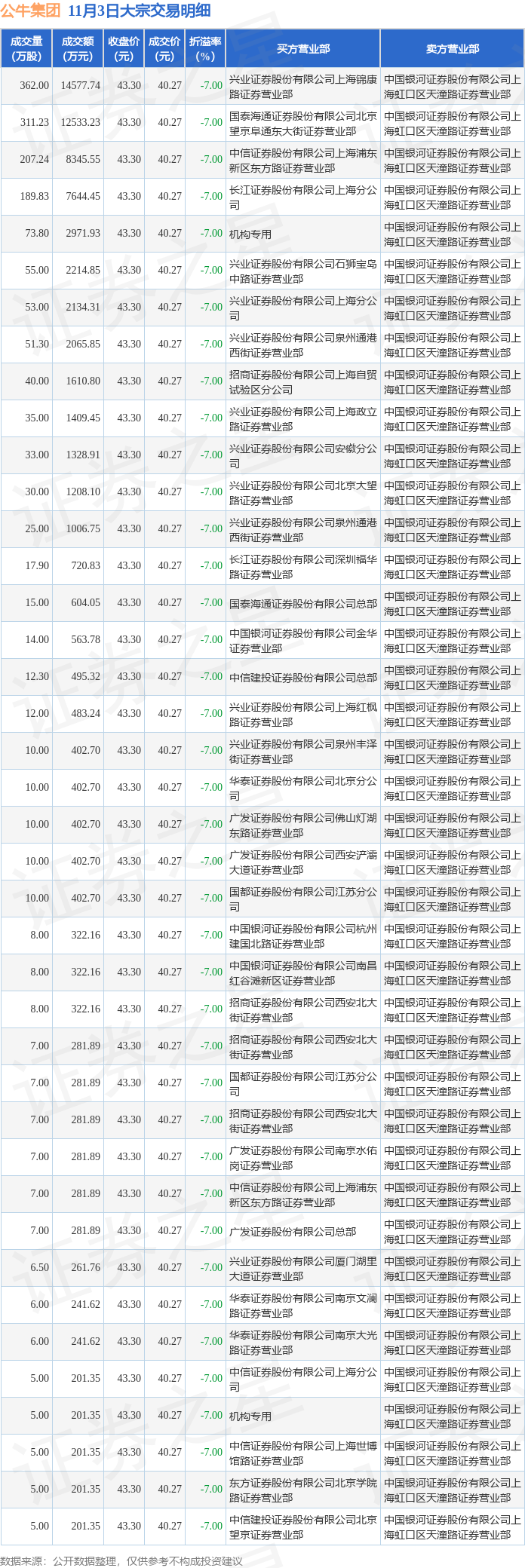 证券之星消息,11月3日公牛集团发生大宗交易,交易数据如下: