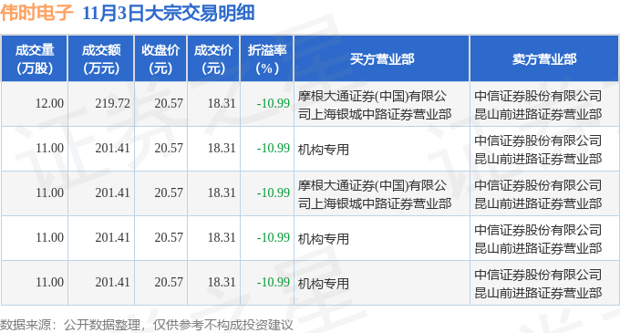 证券之星消息,11月3日伟时电子发生大宗交易,交易数据如下: