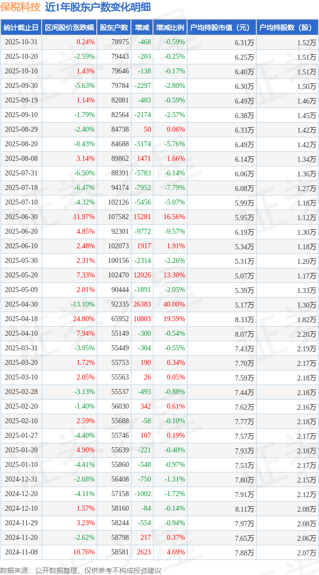 从股价来看,2025年10月20日至2025年10月31日,保税科技区间涨幅为0.24%,在此期间股东户数减少468.0户,减幅为0.59%。
