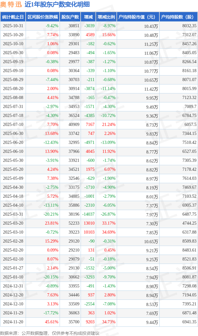 从股价来看,2025年10月20日至2025年10月31日,奥 特 迅区间跌幅为9.42%,在此期间股东户数减少3039.0户,减幅为8.97%。