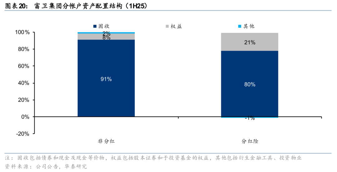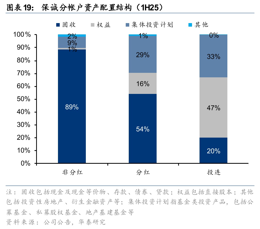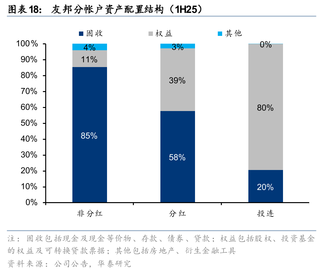 以友邦、保诚和富卫集团为例,其投资策略在传统和分红账户有较大差异。对于由股东承担风险的非分红账户,投资策略相对保守,权益配置比例低;由客户承担部分风险的分红账户,投资策略相对积极,权益配置比例有所升高;投连账户的配置思路则更为激进。1H25末友邦的非分红/分红/投连账户中,权益资产的投资比例为11%/39%/80%,依次递增;保诚则为1%/16%/47%;富卫集团则是8%/21%/未披露。