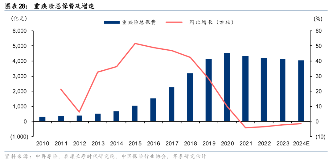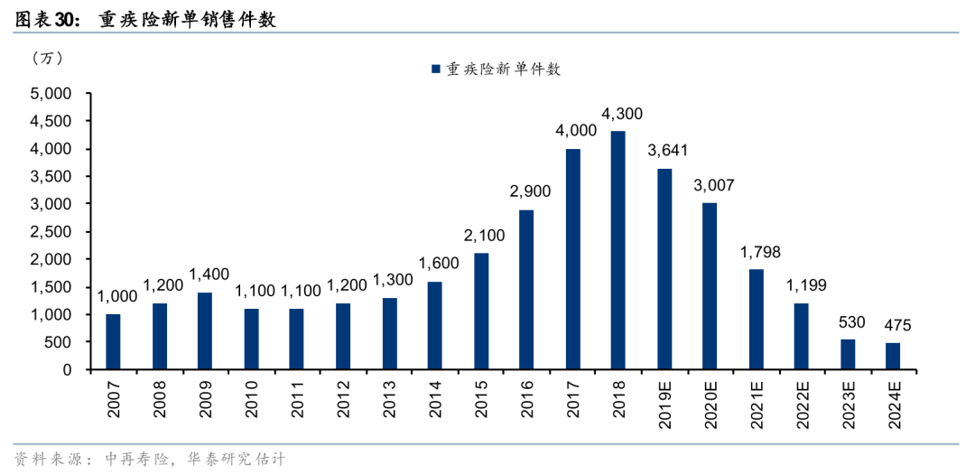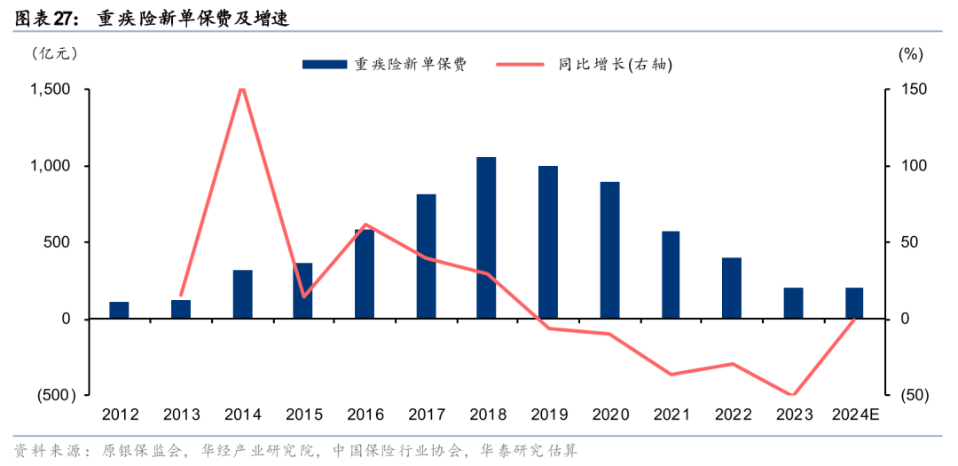 2) 2021至今:重疾险快速下滑。加速度增长之后的快速下滑可能也并不意外。在诸多推动因素逐渐消失,甚至成为拖累因素之后,重疾险中短期不可避免的走向低迷。我们认为,某种程度上,前期的加速度增长可能存在人为拔高因素,透支了重疾险的发展空间,之后重疾险的低迷或许也是某种意义上的“修生养息”。2019-2020年重疾险已经出现了增长乏力的现象,2021年在疫情等外部影响之下,出现了大幅下跌,并延续至今。