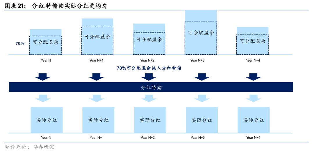 分红险的当年盈余包括利差益、死差益、费差益等(具体依赖于保单设计)。根据监管规定,分配给保单持有人的分红不低于可分配盈余的70%。可分配盈余的金额根据保险公司经营情况、资本市场表现而有所差异。为了平滑分红的波动性,保险公司需要对分红险账户提取分红险特别准备金或者平滑准备金,用于平滑不同年度之间的分红水平,目标是将实际的分红稳定在一个可预期可持续的水平上。