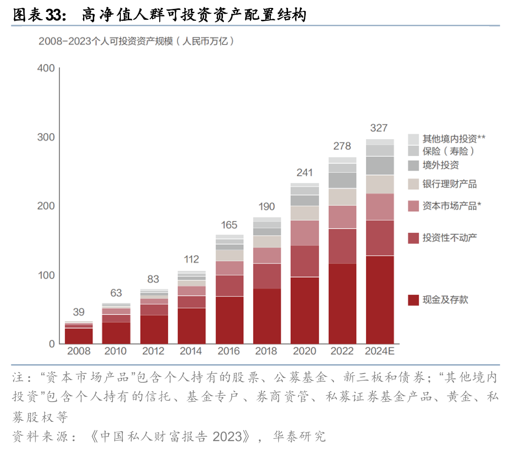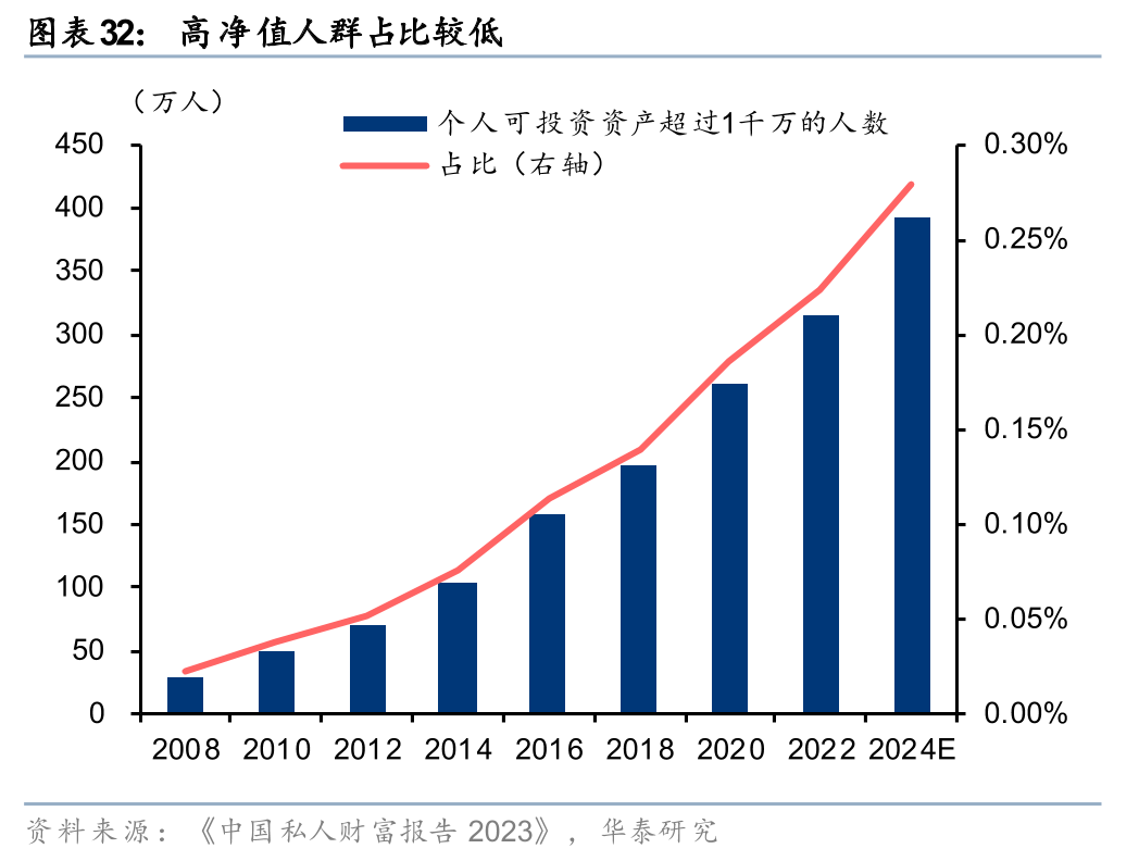 在商业银行中,已有面向高净值客户的专业理财服务,即私人银行业务。私人银行通常指银行面向高净值客户及其家族提供的一对一、高端定制财富管理服务,包括资产配置、家族办公室服务、信托/财富传承、税务/法律规划、非标准化融资/信用服务等。商业银行的私人银行业务,作为服务高净值客户的顶级财富管理领域,近年来已成为各大银行战略布局的重点。服务客群主要为金融资产达到一定门槛的高净值人群,常见门槛在600万元至1000万元人民币以上。服务内容已从基础的资产配置,扩展至投资管理、财富传承、税务法律咨询、家族治理、企业融资、健康医疗、子女教育等综合性服务。根据中国银行业协会发布的《中国私人银行发展报告(2024)暨生成式人工智能赋能私人银行专题报告》,截至2023年底,中资私人银行的资产管理规模达到24.6万亿元,较上年增长13.11%;中资私人银行客户数增至177万人,同比增长12.07%。