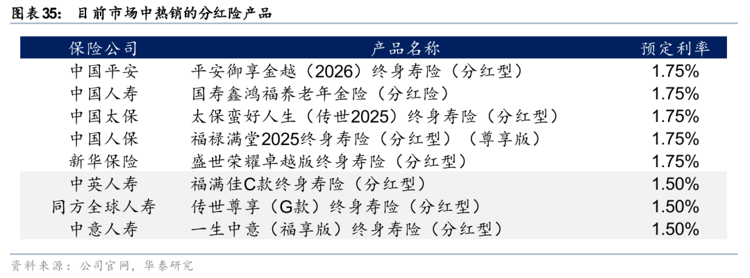 分红险在经历多年沉寂之后,正快速重新回到市场主流,低利率环境下保险公司和客户之间的利益重新平衡是重要推动力。与传统险(业内将不分红、收益固定的保险产品称为传统险)相比,分红险的投保人利益与保险公司相对一致,更适合当前较低的利率环境。对保险公司而言,分红险的预定利率或者刚性成本较低,有利于减轻利差损压力;对客户而言,可以享受权益投资或利率上行带来的超额收益,长期有利于抵御通胀对保险利益的侵蚀。在2023-2025年连续三年保险产品预定利率下调、传统险性价比不断恶化之后,分红险在供给和需求两侧都得到了更多的关注,正快速成为各家公司的发展重点。