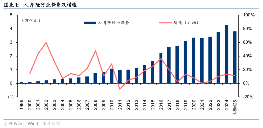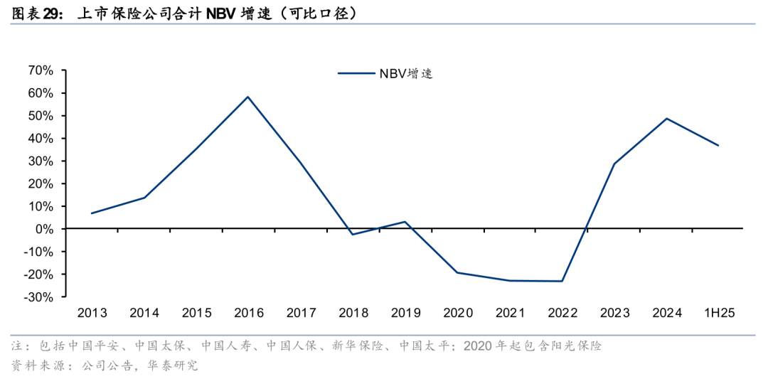 分红险在经历多年沉寂之后,正快速重回市场主流,低利率环境下保险公司和客户之间的利益重新平衡是重要推动力。与传统险相比,分红险的客户利益与保险公司相对一致,更适合低利率环境。对保险公司而言,分红险的预定利率或刚性成本较低,有利于减轻利差损压力;对客户而言,可以享受权益投资或利率未来上行带来的潜在收益,长期有利于抵御通胀对保险利益的侵蚀。分红型重疾险开闸有里程碑意义,提升了消费者福利并改善保险产品结构,抵御利差损压力。消费者保障缺口依然存在,重疾险潜在增长空间可观(《重疾险有望迎来发展新周期》,2025年10月5日)。我们预计在分红险推动下,上市公司2026年NBV增速中枢有望达到20%左右。