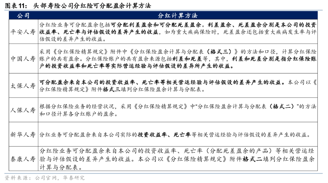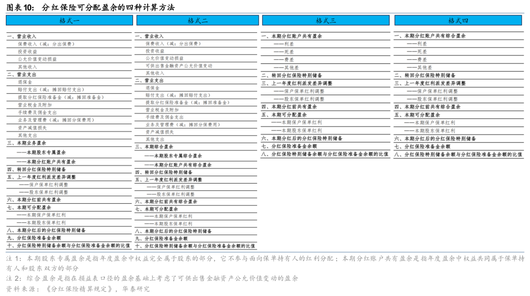 3) 格式三/格式四则考虑共有盈余/共有综合盈余中的利差、死差、费差和其他差来计算可分配盈余。不同公司所选择的计算方式各有不同,例如,国寿选择格式三,用共有盈余中的利差和死差等计算可分配盈余;人保人寿则采用格式二,基于综合盈余来计算可分配盈余。